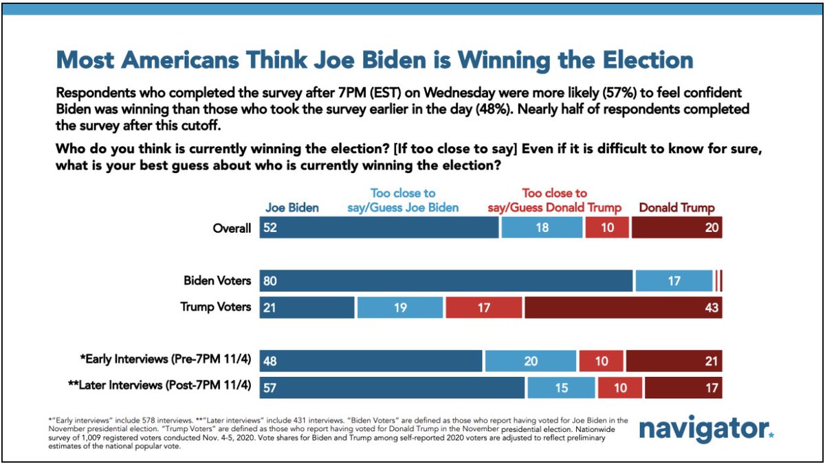 Newly released results from Navigator Research, weighted to 2020 results (currently an estimate of 51-47 Biden among voters) finds the public largely perceive Biden to be winning, including many who voted for Trump who agree.