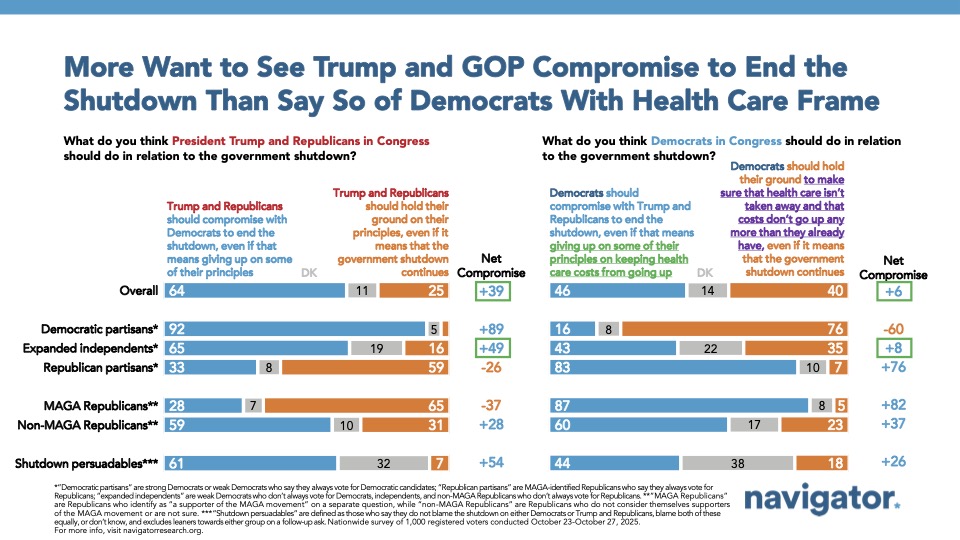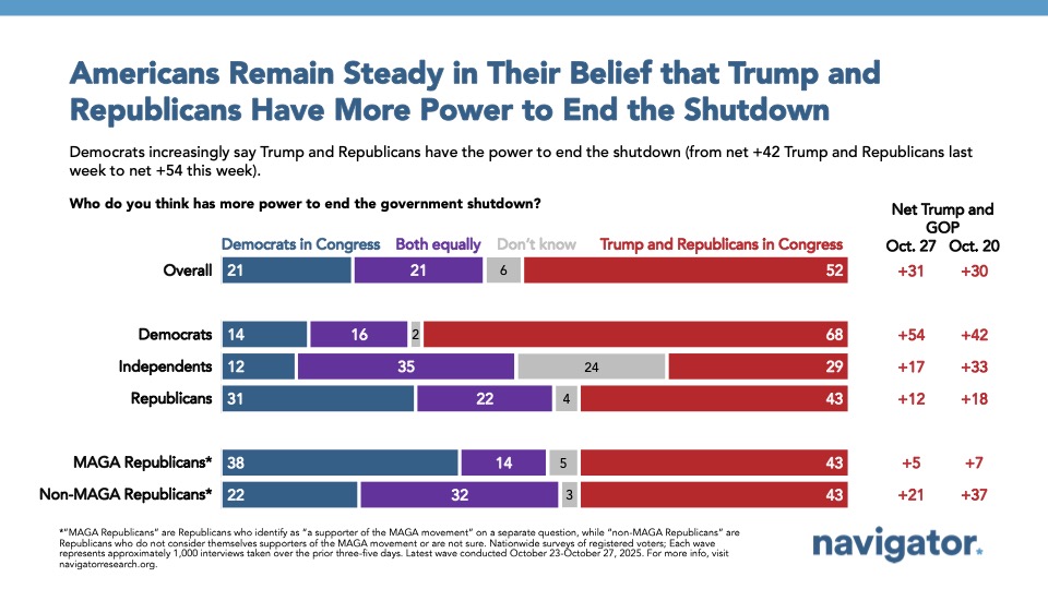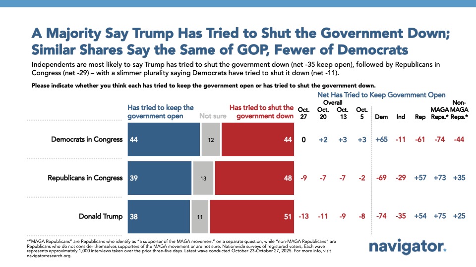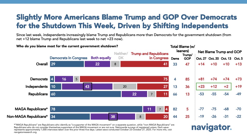• Americans now blame Trump and Republicans for the shutdown by 14 points, up from 10 points last week.