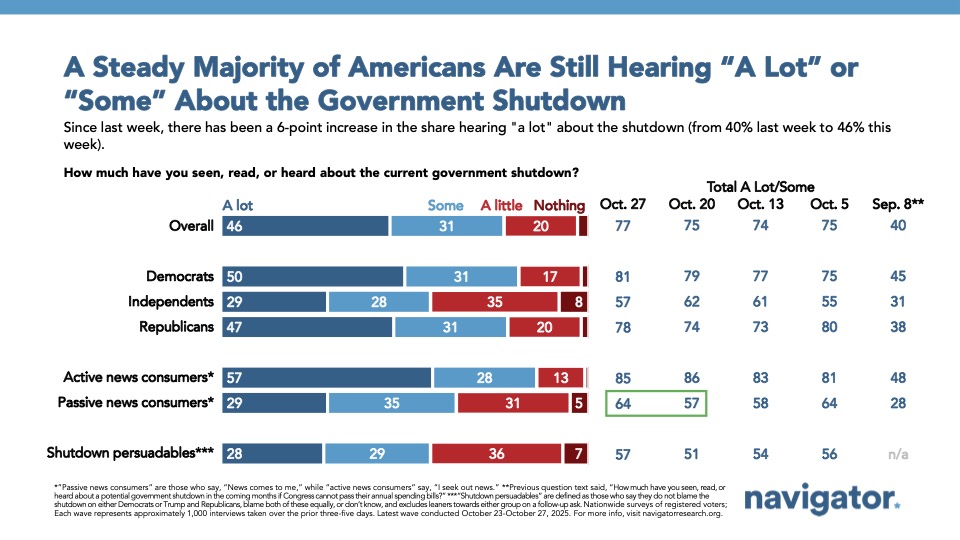The government shutdown is still top of mind for Americans. Three quarters of respondents are hearing at least some news about the government shutdown, similar to 75 percent from our tracking last week. Awareness is slightly lower among independents at 62 percent. This week’s tracking finds a 9-point uptick in awareness among passive news consumers, 66 percent of whom have now heard a lot or some about shutdown.
