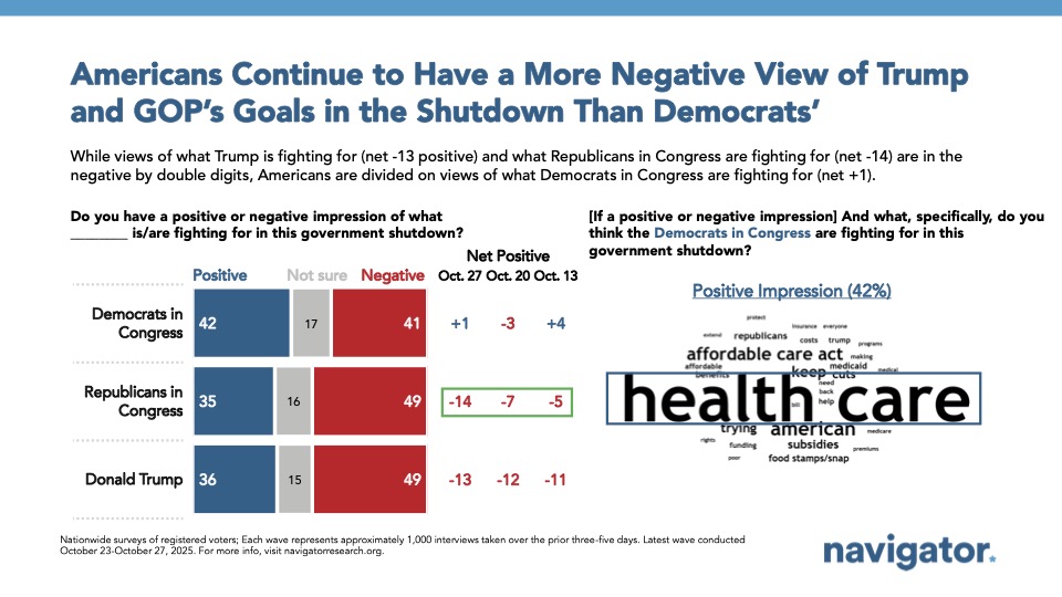 Republicans in Congress, however, fare much worse on this question (-14 points underwater), doubling their negative margin on what they’re fighting for in this shutdown from last week (-7 points). Similarly to the positive sentiment for Democrats, negative sentiment for Republicans is driven by concerns over health care. Donald Trump, however, has remained stable week over week in the amount of Americans who have a negative impression of what he’s fighting for in the shutdown.