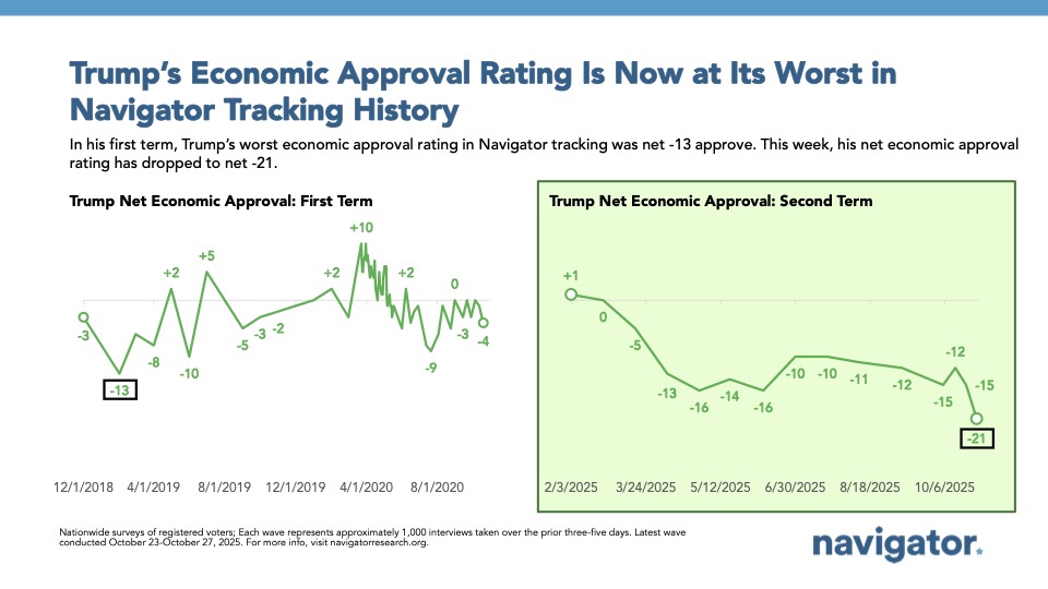 • Trump reaches his lowest economic approval in Navigator tracking since 2018.