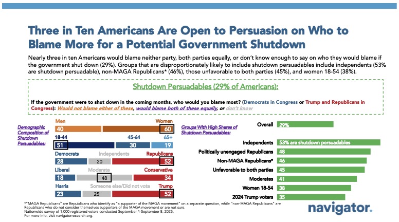 Global Strategy Group conducted a public opinion survey among a sample of 1,000 registered voters from September 4-September 8, 2025. 100 additional interviews were conducted among Hispanic voters. 100 additional interviews were conducted among African American voters. 75 additional interviews were conducted among Asian American and Pacific Islander voters. 100 additional interviews were conducted among independent voters. The survey was conducted online, recruiting respondents from an opt-in online panel vendor. Respondents were verified against a voter file and special care was taken to ensure the demographic composition of our sample matched that of the national registered voter population across a variety of