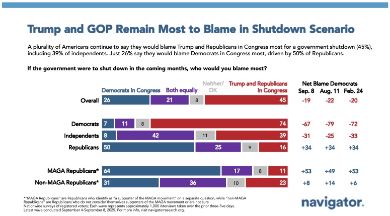 - Notably, in a break from what we usually see on highly partisan questions that name Trump and Republicans, 25 percent of Republicans say they would blame both sides equally, including 36 percent of non-MAGA Republicans. Independents are split: 42 percent say they would blame both parties equally, while 35 percent would blame Trump and Republicans in Congress.
