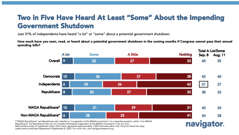 Awareness of a potential government shutdown is relatively low compared to other recent news stories. Just nine percent of Americans say they’ve seen, read, or heard “a lot” or about a possible shutdown, while 40 percent report having heard at least some. This lags well behind other news and events in our August Survey: 66 percent of Americans have heard about Trump and the congressional GOP’s Medicaid budget cuts, including 36 percent who have heard “a lot,” and 61 percent of Americans have heard about Texas redistricting.