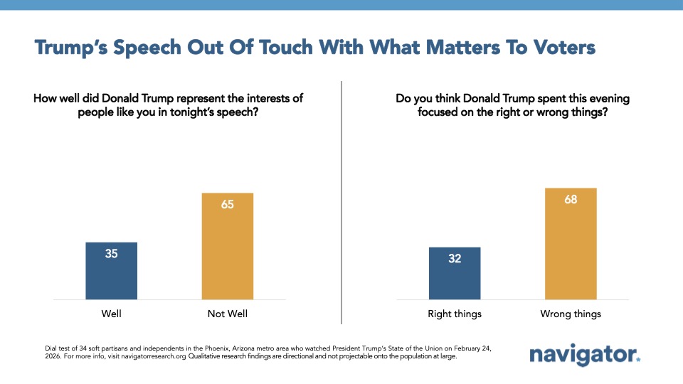 *GBAO conducted a live-reaction dial group on behalf of Navigator Research on February 24, 2026 during President Trump’s State of the Union address with 34 participants in the Phoenix, Arizona metro area. Participants included a roughly equal mix of soft partisans (not strong Democrats, not strong Republicans) and independents without a partisan lean. Participants were also a mix based on gender, race/ethnicity, and educational attainment.