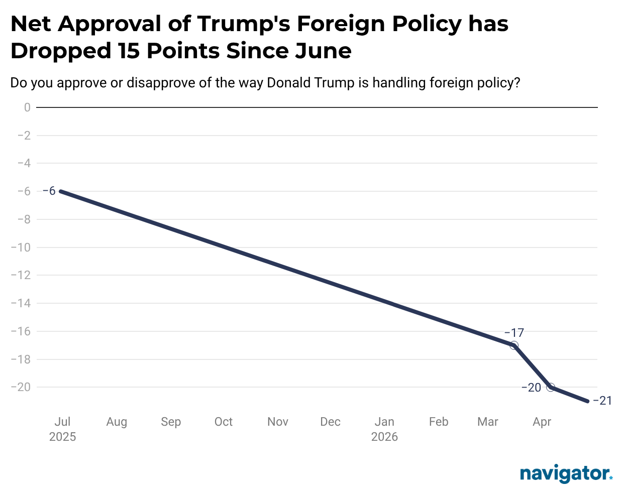 Nearly three-in-five Americans oppose Trump’s handling of foreign policy (58%), including two-thirds of independents (67%). Trump’s net approval on foreign policy has fallen 15 points from -6 in June 2025 to -21 today.